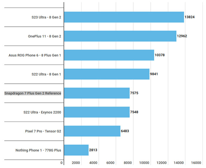 При тестировании возможностей графики Snapdragon 7+ Gen 2 в 3DMark Wild Life результаты уже не такие впечатляющие, но далеко не печальные — графический контроллер Adreno 725, входящий в состав Snapdragon 7+ Gen 2 обошел графику в составе Exynos 2200, Tensor G2 и Snapdragon 778G+, но вполне предсказуемо уступил решениям в Snapdragon 8 Gen 1, Snapdragon 8+ Gen 1 и Snapdragon 8 Gen 2.