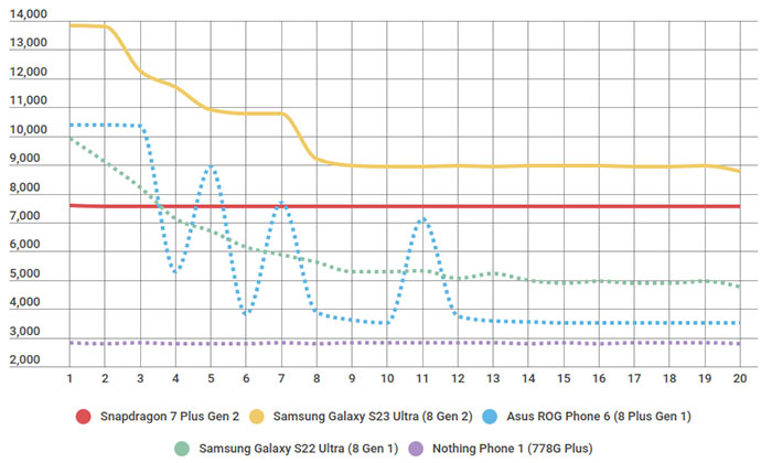 Кроме того, в стресс-тесте 3DMark Wild Life образец на Snapdragon 7+ Gen 2 показал высокую стабильность при длительной нагрузке на уровне 99,8% от номинальных показателей, уступив лишь Galaxy S23 Ultra с чипом Snapdragon 8 Gen 2 на борту. Впрочем, такой результат журналисты объяснили с «некоммерческим» дизайном прототипа.